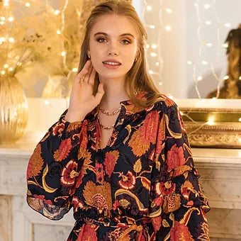 From the Australian label Jaase comes this stunning Caviar Monroe Mini. The perfect dress for parties. A spectacular dress that is a flattering in that you can adjust with same fabric belt. Floral print with a dark blue background and neckline with buttons. Puffed sleeves with rubber on the cuffs.