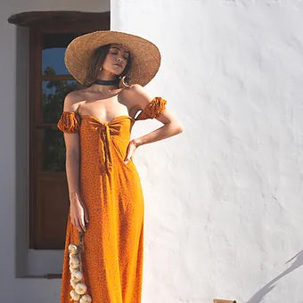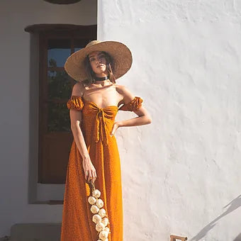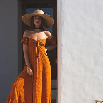Sexy and feminine long boho dress. Elastic on the back for a perfect fit, flowy it falls very nicely on the body with frilled – detailed sleeves that can be worn on or off to the shoulders. The silhouette looks like flattering.