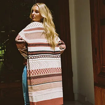 From the Australian label Jaase is the Hazel Knit. Autumnal inspired Aztec cardigan with long sleeves and midi length. Perfect for Autumn and Winter and for those summer nights whether on the patio or in the field.
